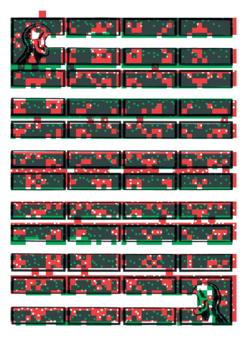 'This No Place to Stay' is a semi-fictional, semi-biographical story by the German artist Michael Jordan. His bearded alter ego travels through a coffee cup into a labyrinth inside a hospital laboratory. Hopefully the wound in the nurse's hand can rescue him...